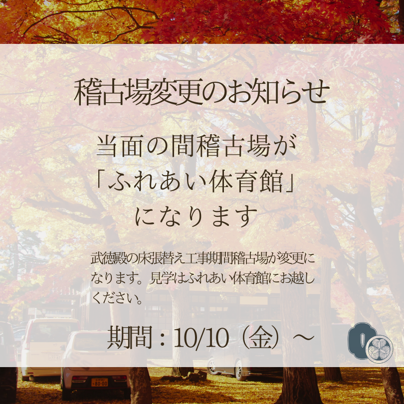 改修工事作業中は、福島県立会津学鳳中学校の東側にある「ふれあい体育館」にて稽古を行います。
